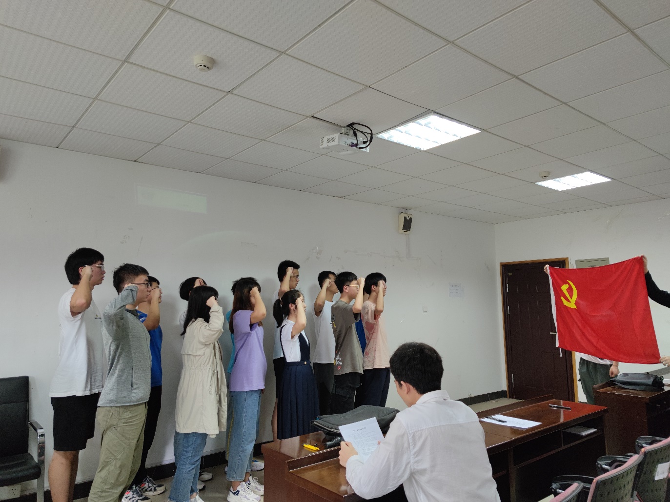 在张智洋同志的带领下,新接收的预备党员面向党旗宣读入党誓词。