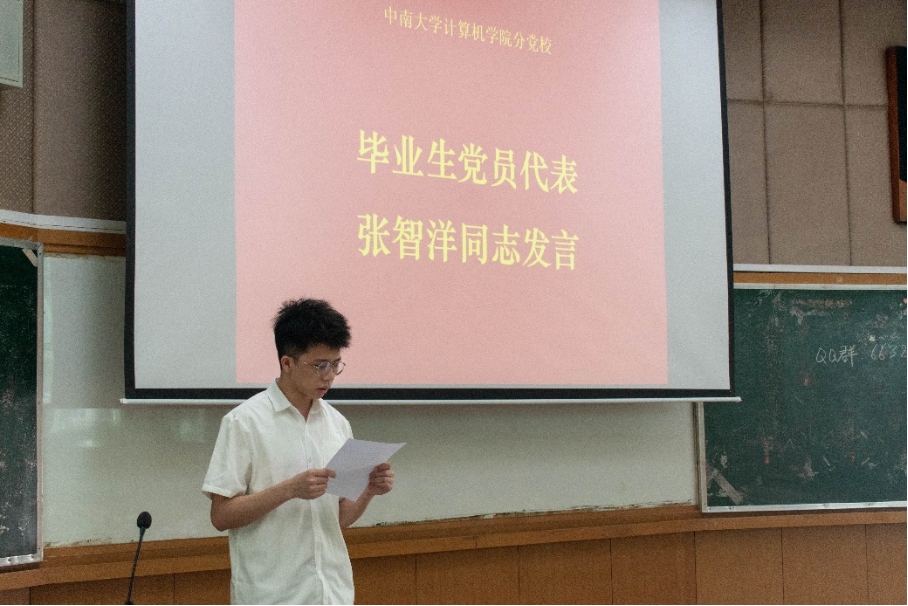 议程第三项,毕业生党员代表张智洋同志发言。他讲述了自己的入党经历,从学生工作、党员标准、学习成绩三个方面严格要求自己,做到全面发展。无论未来去到何地,都要起到党员的先锋模范作用。