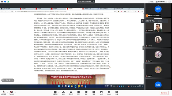 会议一共分为两个流程:首先,由李杰、张光辉、肖美红、罗爱平、蒋昊航、谭文钊、吴振杰、李斌、兰鹏、刘世震、杨若等十一名同志一起分段诵读《中国共产党第十九届中央委员会第六次全体会议公报》全文内容,全体研究生党员同志跟随诵读对党的百年奋斗的重大成就和历史经验问题进行学习;其次,李杰同志组织各党员同志观看十九届六中全会中共中央新闻发布会,通过有关负责人对全会精神的介绍,对《决议》内容的解读以及对媒体问题的回答,加强研十支部