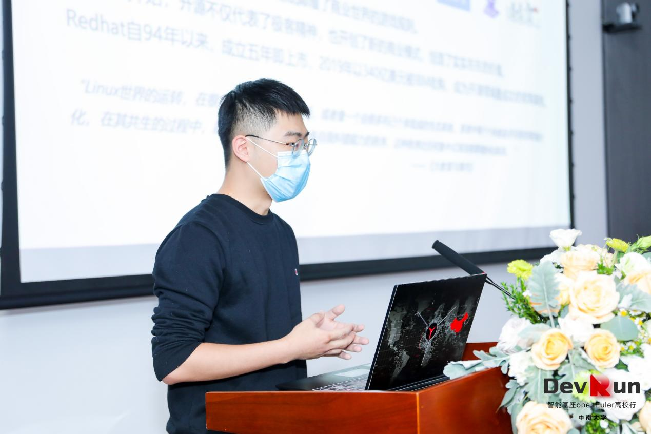 而后,华为高级软件工程师、openEuler社区布道师朱云成先生为同学们带来“基于openEuler开源社区的Linux学习新体验”主题分享,他从Linux系统开始,介绍了linux开源系统与openEuler系统的关系,并由此引出openEuler系统取得的创新和成绩。截至目前,openEuler社区已有近30万用户,正围绕Linux系统,构筑以openEuler系统为重心的技术生态。分享最后进入互动环节,朱先生认真倾听同学们的问题,并一一解答困惑。