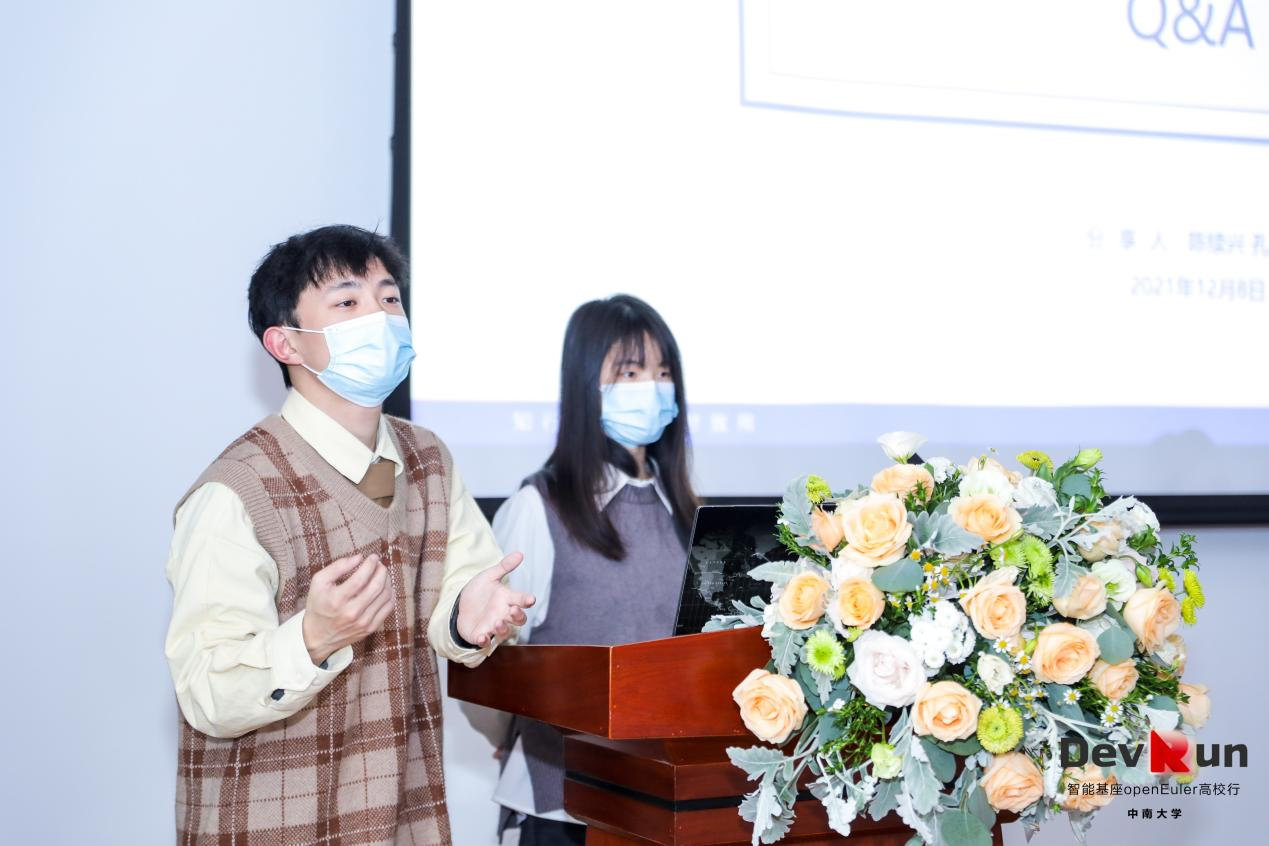 随后,我校参与开源summer活动的优秀学生代表陈续兴同学和孔克青同学做出了“openEuler 开源summer 2021参与体会”主题分享,讲述收获的故事。在当期的开源summer实践活动中他们完成了自己的项目,锻炼了项目的开发能力,更重要的是通过本次实践活动接触到了行业的前沿技术和精英,增长了专业知识的同时也开阔了技术眼界。