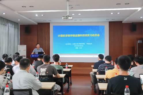 2022年9月2日上午,中南大学金融科技(华锐)特色研究生班项目启动会暨实习动员大会在中南大学计算机楼举办。学院院长王建新、学院党委副书记史建权、学院副院长邓晓衡、学院金融科技研究中心主任高建良、华锐技术副总经理宿旭升先生出席大会并致辞。导师代表和金融科技班全体研究生参加了此次会议。会议由高建良教授主持。