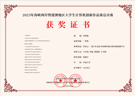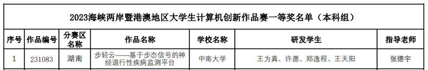 7月4日,2023海峡两岸暨港澳地区大学生计算机创新作品赛总决赛在澳门理工学院顺利落下帷幕。该赛事共吸引两岸三地2千余个项目参赛。我院21级图灵班(王为真,许愿,郑逸程)与湘雅(湘雅临床八年制2103班王天阳)合作的项目《步轻云——基于步态信号的神经退行性疾病监测平台》从两岸三地2千余个项目中脱颖而出,在总决赛上取得了一等奖第一名的好成绩,该项目指导老师为张德宇副教授。