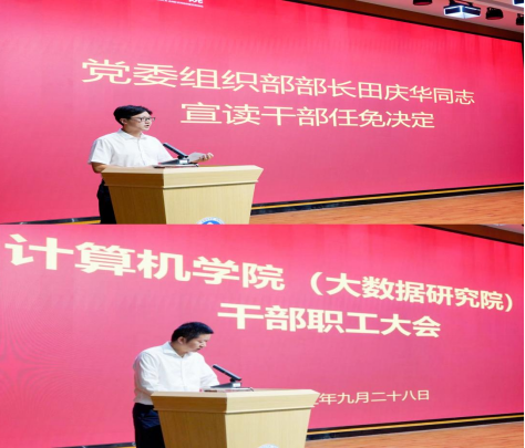 田庆华同志代表校党委、校行政宣布了干部任职决定:赵晓霞同志任院党委书记,李敏同志任院党委委员、院长,王新辉同志任院党委副书记,冯启龙同志任院党委委员、副院长,夏佳志同志、黄家玮同志任副院长。
