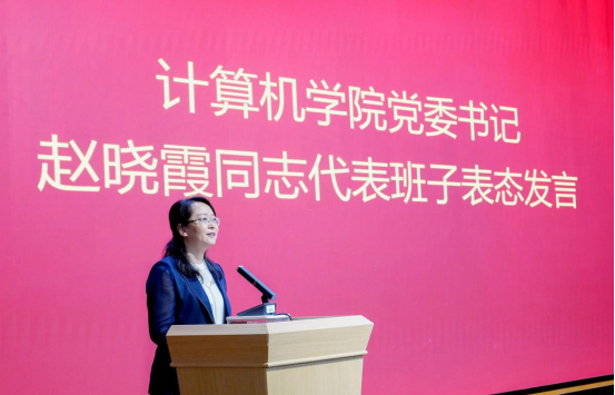 赵晓霞同志代表学院班子做表态发言,全院师生对学校党委决定表示坚决拥护,坚决服从,对学校党委给予学院领导班子建设和事业发展的高度重视和深切关怀表示感谢,向上一届班子成员的辛勤工作和无私奉献表示衷心感谢和诚挚敬意。赵晓霞代表领导班子庄严承诺:第一,始终牢记殷殷嘱托,始终心怀“国之大者”,旗帜鲜明讲政治,深刻领悟“两个确立”的决定性作用,增强“四个意识”,坚定“四个自信”,做到“两个维护”,始终坚持以习近平新时代中国特色社会主义思想为指导,始终坚持全面贯彻党的教育方针,把牢社会主义办学方向,以高质量党建引领学院事业的高质量发展;第二,始终牢记艰苦奋斗,一心一意聚焦发展。坚定不移贯彻新发展理念,主动顺应引领时代潮流,推动学科创新发展,引领计算系统关键领域研究,国际化人才队伍建设;第三,始终牢记以人为本,用心用情服务师生。始终坚持以人民为中心的发展思想,自觉践行全心全意为人民服务的根本宗旨;四是始终牢记廉洁自律,坚持高线、坚守底线,认真履行全面从严治党主体责任,持续加强班子自身建设,团结共事、一心干事、合力成事。