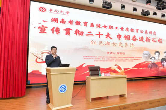“宣传贯彻二十大 巾帼奋进新征程”湖南省教育系统女职工素质教育公益讲座在中南大学新校区信息楼108报告厅开讲。湖南省政府参事室特约研究员、省关心下一代工作委员会副主任、省委宣传部原副部长、省委党史研究室原主任张志初以《红色湘女更多情》为题,面向200余名女教职工代表进行宣讲。讲座由校工会和校党委宣传部联合举办,威尼斯87978797老品牌承办,校党委副书记、工会主席、宣传部部长付刚华主持。