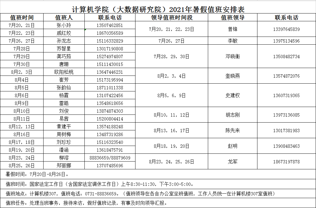 5.严格遵守假期值班纪律。除国家法定节假日、周末外,值班人员必须按时在办公室坐班,时间为上午8:30-11:30,下午3:00-5:00。遇有突发事件和重要紧急情况要及时准确报值班人员(值班表见附表2),并快速妥善处置。因工作纪律落实不到位,导致工作延误或造成不良后果的,学院将按规定严肃追究相关人员责任。