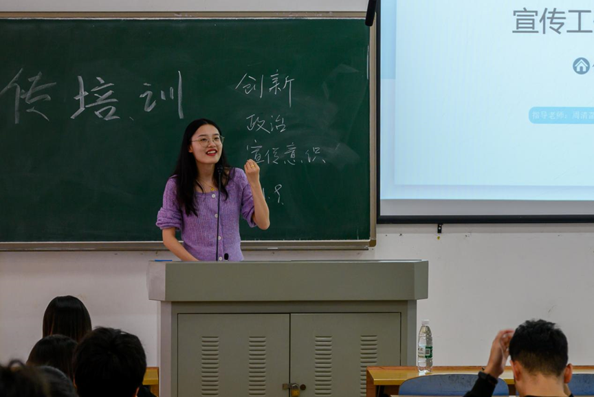 大会伊始,周清菡老师表明宣传一直以来是学生工作的重要抓手,向各位宣传工作者提出要求,在日常宣传工作中,需要培养自身的创新意识,政治意识,宣传意识,真正成为一个有价值的宣传人才。她对宣传委员们寄予厚望,希望大家在日后的工作当中,能够更多的去展现风采,去挖掘周围的新鲜事,打造更丰富的威尼斯87978797老品牌。各位宣传委员应充分发挥自身的主观能动性,发现生活中的闪光点,激发同学们发现美好的热情,让宣传工作更加丰富多彩。