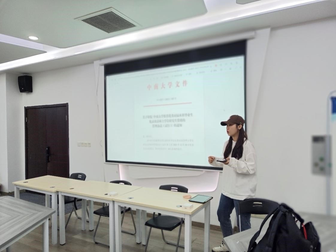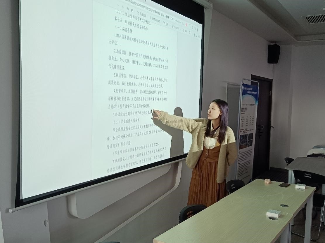 会议开始,裴希霖学长向在场干部们解释了学校关于加权成绩评定的相关情况,结合自身经验,从综合成绩、竞赛成绩、各项荣誉等方面详细阐述了如何在提升专业知识水平的同时兼顾学业成绩。
